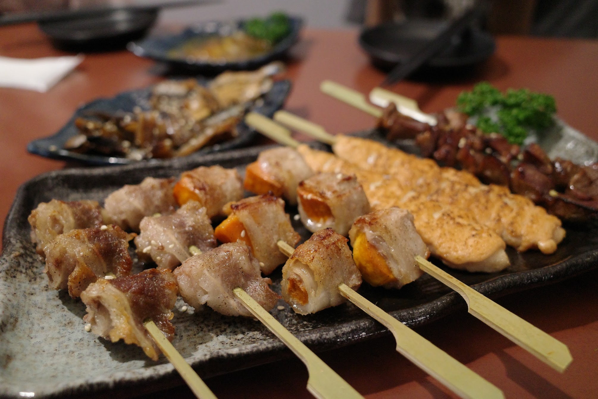 雞膝軟骨(兩串)100元/豚大腸(兩串)100元/雞頸肉(桂丁雞兩串)120元/雞丸子青椒組(兩串)180元