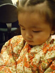 新年好,我是馨馨,給常來看媽咪blog的姨叔姑伯們拜年這是年初二的造型,大姑姑買給我的超豪華和服後台綁一個大紅蝴蝶結《桌上有好東西???》 髮型是阿罵設計的,小黑人頭,讚吧!聽說等我頭髮…