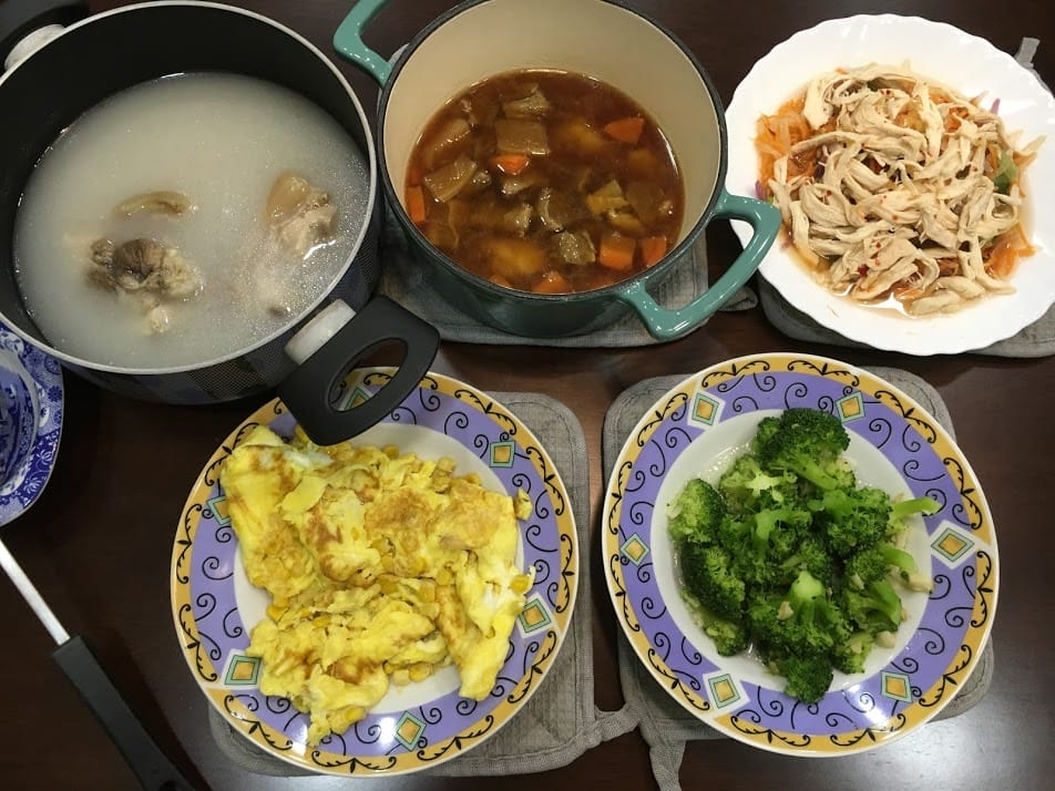 花生黑豬腳湯、和風鮮蔬牛腩、泰式涼拌鮮蔬雞肉➕玉米炒蛋、炒花椰菜 以上四菜一湯,請問各位主婦要花多久時間來煮這一頓? 照我正常主菜速度,前面兩項炖煮差不多就要花1、2個小時跑不掉吧! …
